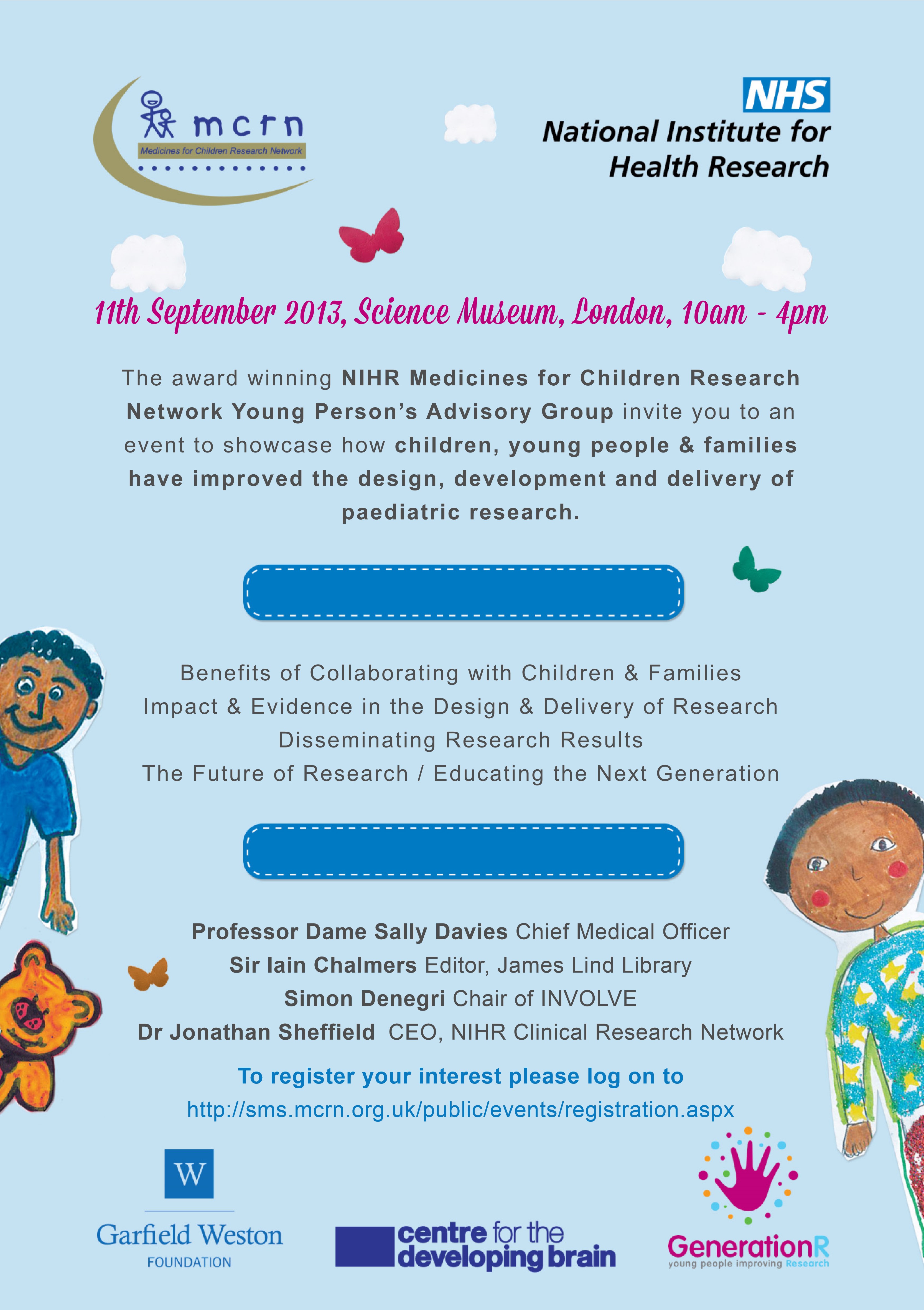 Our Medicines for Children Research Network (MCRN) really has been an exemplar for involving young people in research. Find something as good across Europe and I will eat my hat. Its young person’s advisory group are now hosting a conference of their own – with the support of the Garfield Weston Foundation and the Centre for the Developing Brain, and Generation R – Trust and at the Science Museum on 11th September 2013. Further details on the poster repos below (sorry can’t make them larger) but this link will also enable you to register your interest in going.